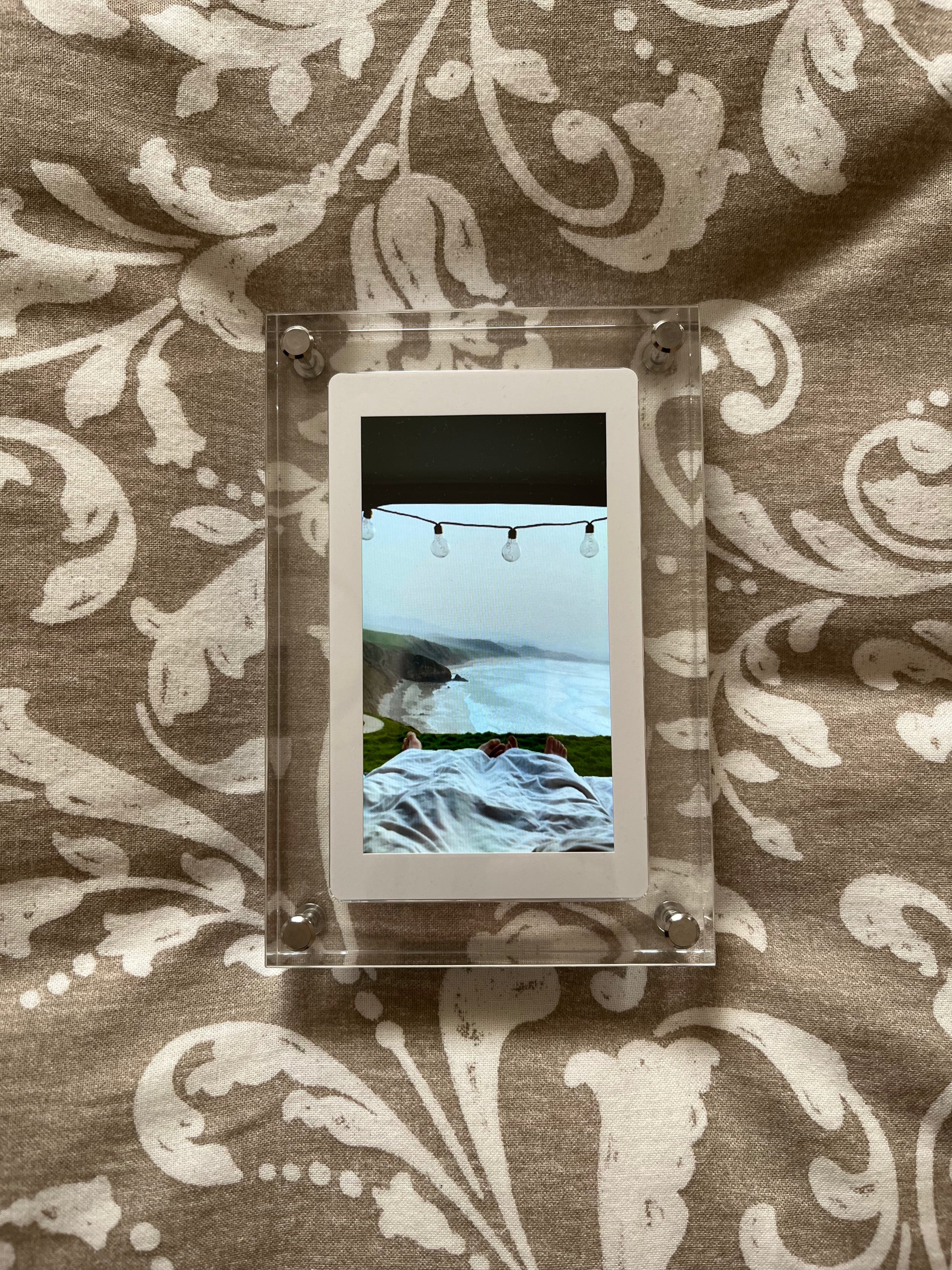 Incluye soporte para mesa, pero también puede colocarse verticalmente en estantería o pared.